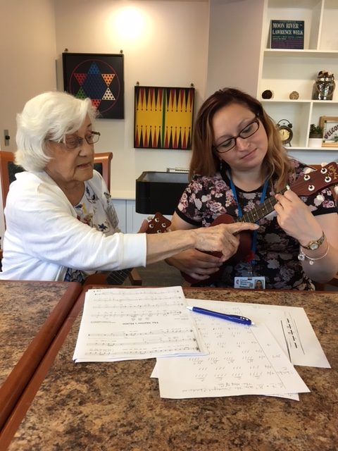 Shortly thereafter, Rose Marie joined Rachel in offering a newly formed group program “Learn the Ukulele”. This group meets every Wednesday afternoon in the activities room for a songfest. There’s also a ukulele program that Rose Marie attends every Thursday afternoon that is run by Rachel and directed by Music Director, Nancy Boyer, also a resident at Wesley Village. This program is usually a one-hour program that consists of residents from different levels of care including independent and personal care. The program provides ukuleles to those who don’t own one, giving everyone a chance to enjoy the unique instrument.
